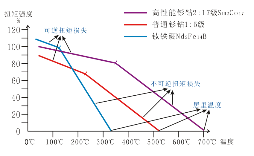 當(dāng)溫度超350℃,高性能釤鈷材質(zhì)的磁鋼將會進(jìn)入不可逆扭轉(zhuǎn)損失。